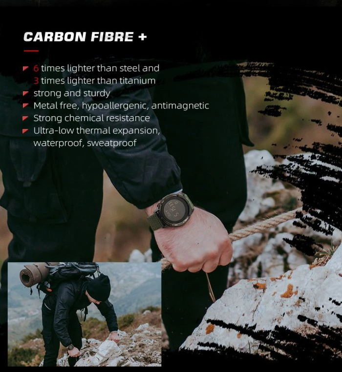 Калъф от въглеродни влакна: Той не само придава изключителен външен вид на часовника, но и осигурява лекота и устойчивост на удар.