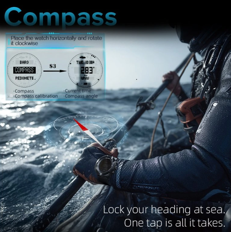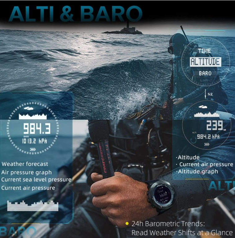 Longtail: Freitaucheruhr mit Tauchprotokoll, Sportuhr mit Schrittzähler und Kalorien, Outdoor-Uhr mit Thermometer und Barometer, zuverlässige Uhr für Reisen und Abenteuer, Uhr mit langer Batterielaufzeit